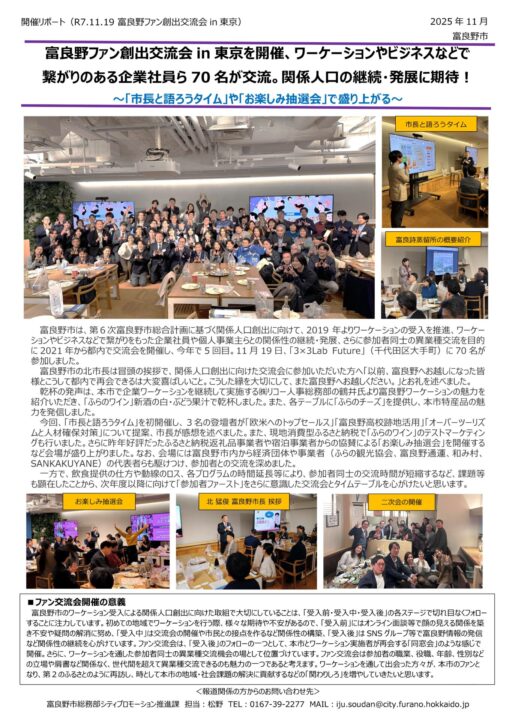 【開催リポート】富良野ファン創出交流会in東京 2025.11.25 令和7年11月19日(水)に都内で「富良野ファン創出交流会in東京」を開催しましたのでお知らせします。 この記事のタイトルとURLをコピーする フリーランス協会 公式note×富良野・親子ワーケーション体験記