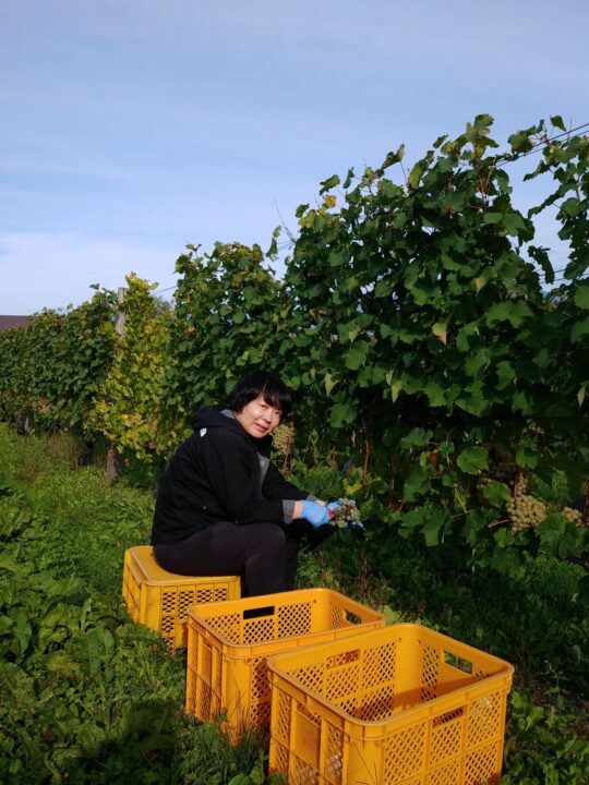 ふらのワイナリーの見学は、ワイン造りのプロセスをお聞きしてから、ワイン用ぶどうの収穫に向かいました。