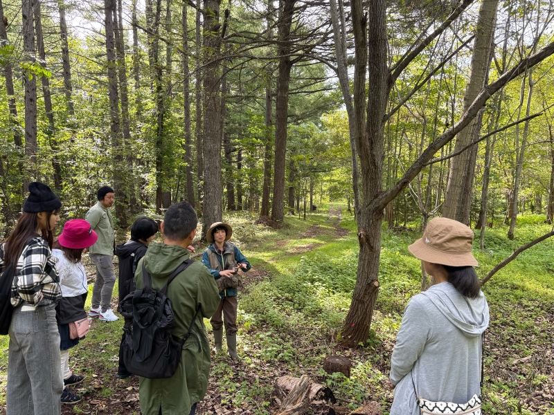 森の中を歩きながら、キノコの話、白樺が森を育てるまで支えとなること、様々な木が臭気を出して自らの森を守っていることなど、富良野自然塾スタッフの話を聞きながら、森そのものが自分たちを守ることに繋がっていることを学びました。