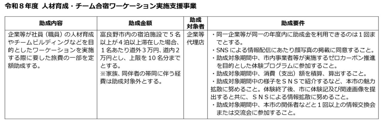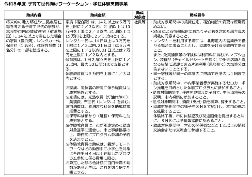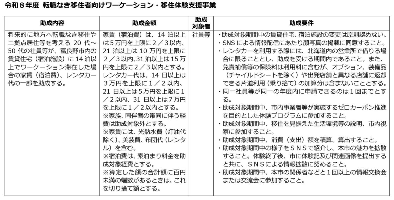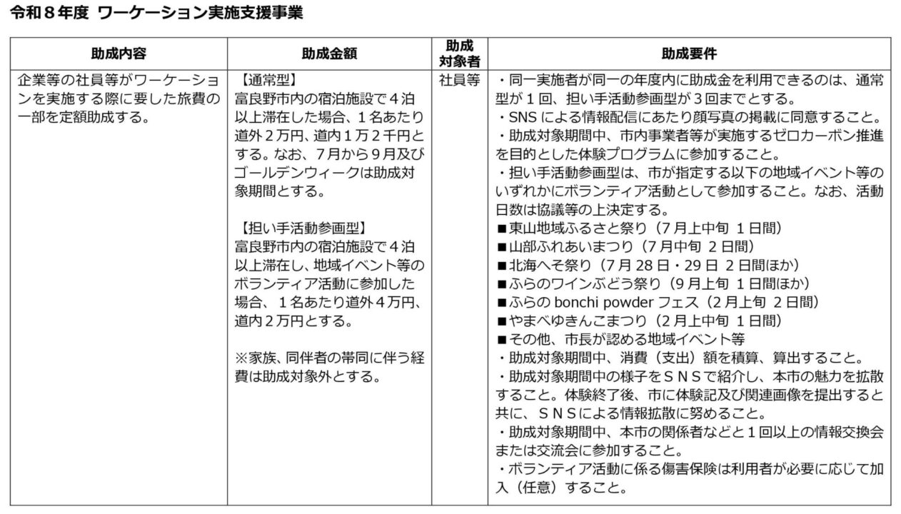 富良野市では、市外の社員等【企業・団体の役員・社員(職員)又はフリーランス・個人事業主】(日本国内に住所を有し、居住実態がある者)が、将来的な移住・二地域居住、半農半X、人材育成・チーム合宿などのワーケーション・移住体験事業実施に必要な経費の一部を助成します。