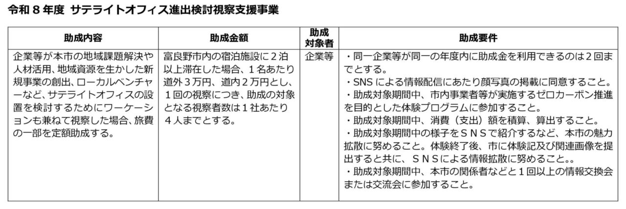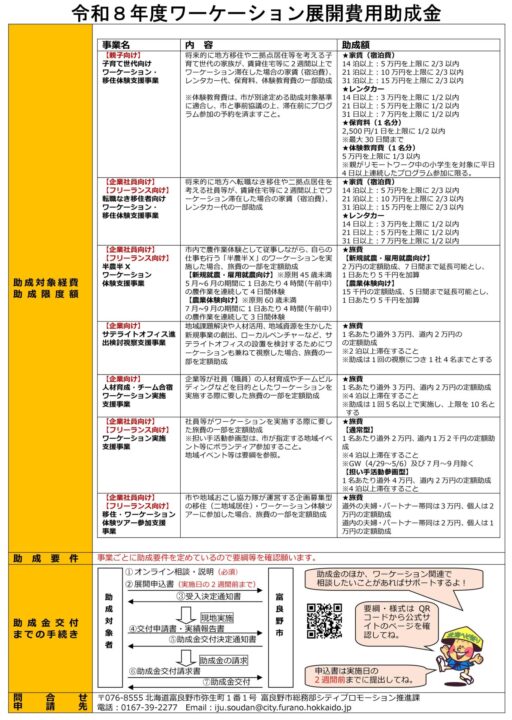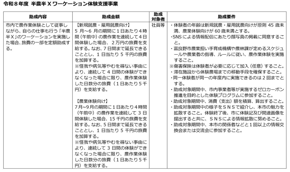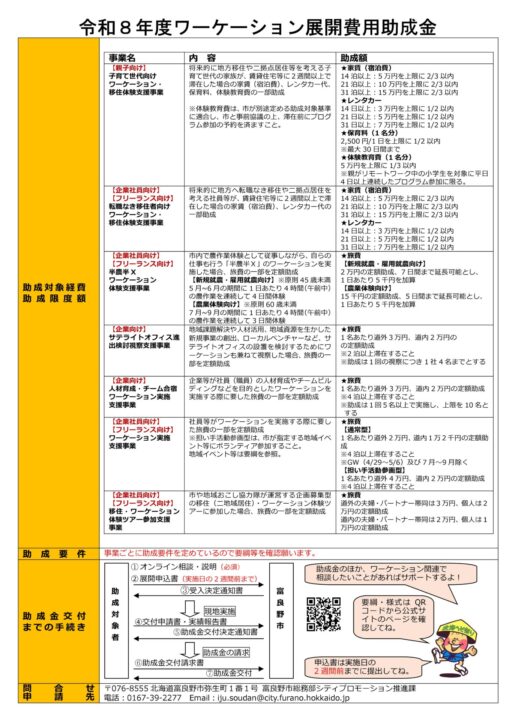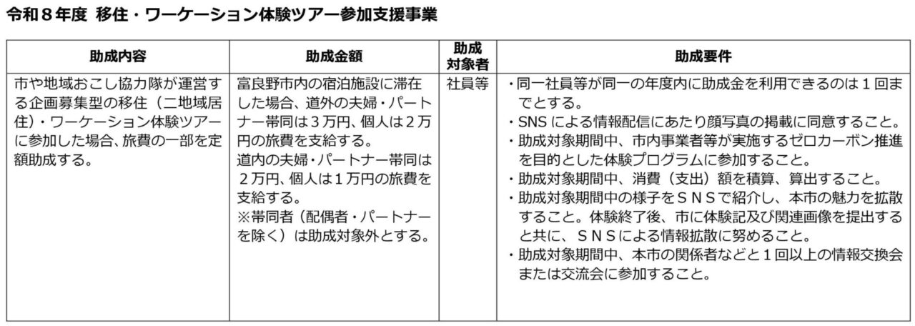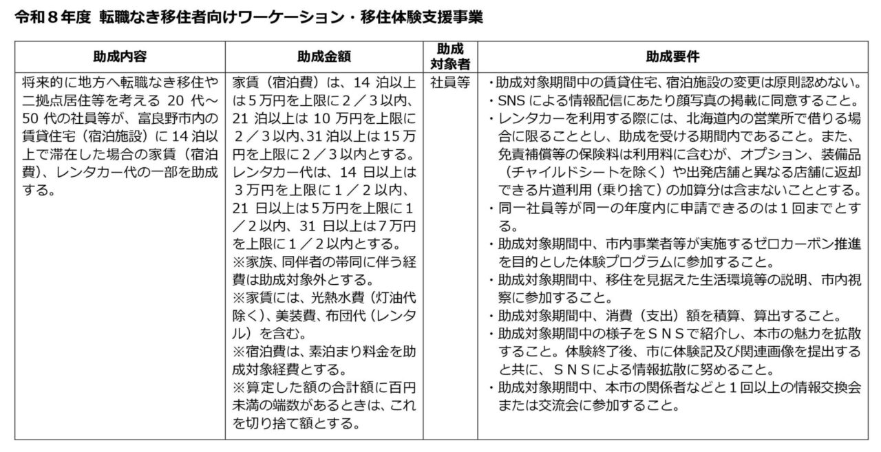 富良野市では、市外の社員等【企業・団体の役員・社員(職員)又はフリーランス・個人事業主】(日本国内に住所を有し、居住実態がある者)が、将来的な移住・二地域居住、半農半X、人材育成・チーム合宿などのワーケーション・移住体験事業実施に必要な経費の一部を助成します。