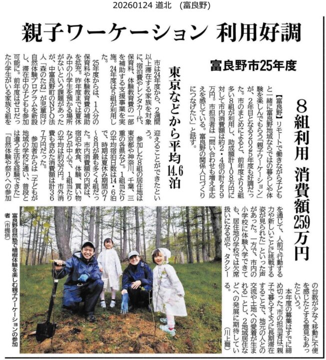 富良野市は、第6次富良野市総合計画に基づく関係人口創出に向けた施策、令和7年度「ワーケーション展開費用助成金」制度の「子育て世代向けワーケーション・移住体験支援事業」の 7 年度の実施結果が判明したことからお知らせします。